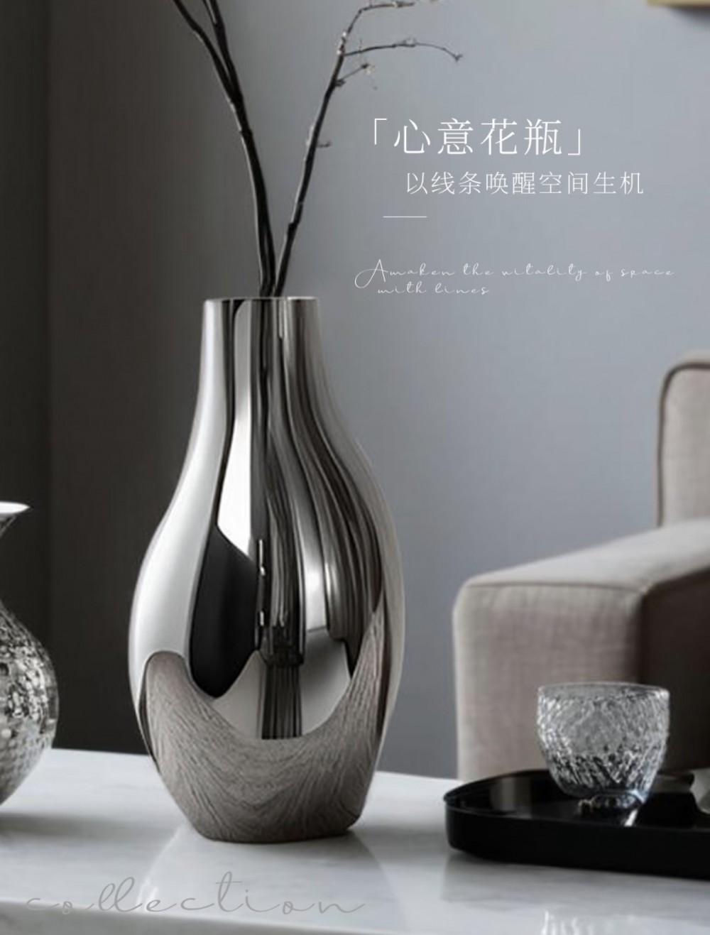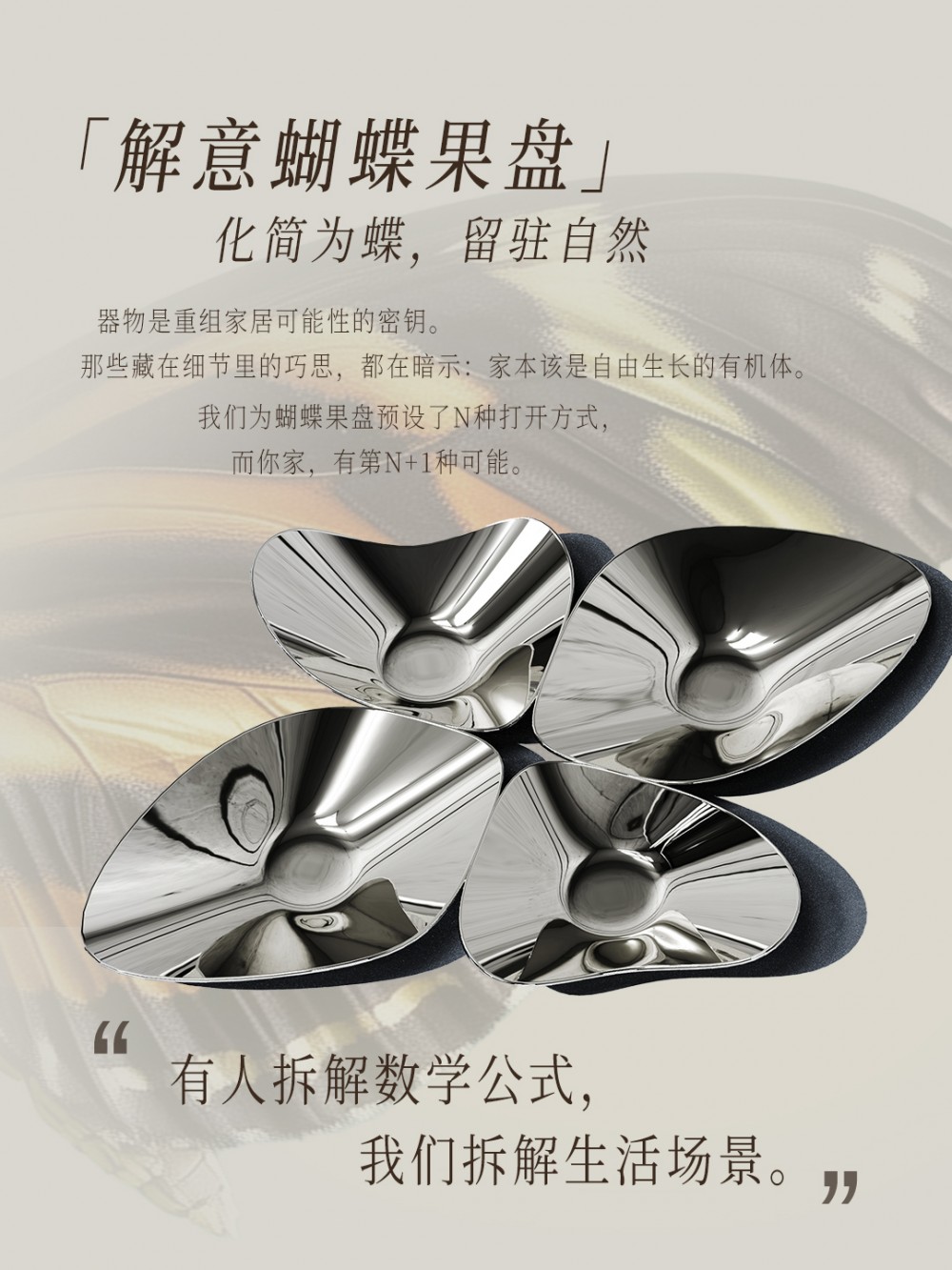 心意花瓶推翻冰冷的定义,让金属学会柔软。以“水墨留白”为设计内核,以线条唤醒空间生机,瓶身采用极简线条勾勒,使用者可通过自由搭配花材,实现“花与器共生”的东方雅韵;蝴蝶果盘则以“蝶舞翩跹”为意象,解构固有蝴蝶造型,以线条勾勒,自由概括,展现流动美感,通过拼接分区收纳功能,让日常摆盘兼具实用性与艺术观赏性。