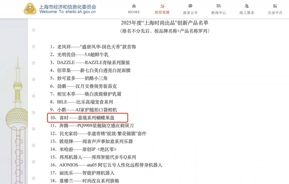 近日,cizzle喜时“意境系列”产品凭借独特的东方美学表达与卓越工艺,成功入选2025年度“上海礼物”品牌商品名录。其中,“蝴蝶果盘”更以突破性的设计理念,斩获2025年度“上海时尚出品”创新产品称号。双项权威荣誉的获得,彰显喜时在文化赋能产品与设计驱动创新领域的深耕成果,亦标志着喜时“生活美学+”战略迈入新的里程碑。